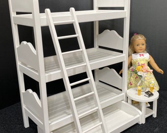Each doll bunk beds for 18 inch dolls set comes with a table lamp, laptop, frame, 3 mattresses, 3 sheets, 3 pillows, curtains, and 4 hangers and a total of three doll beds for 18 inch dolls.
